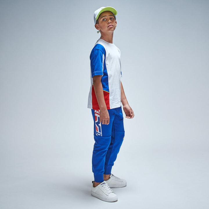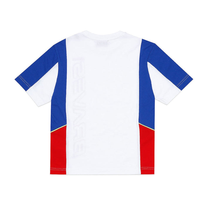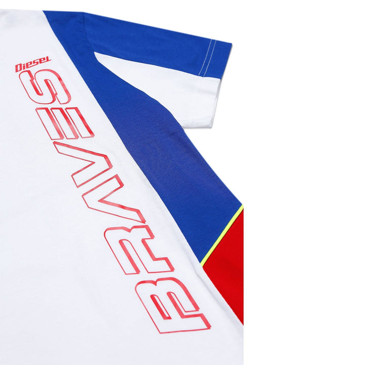 White and blue T-shirt for boys by Diesel, made in soft cotton jersey. There are red and neon yellow reflective trims, as well as a red 'Braves' logo print on the front.