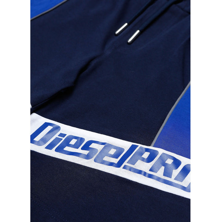 Navy blue jersey shorts for boys by Diesel, made in mid-weight cotton. With a drawstring waist and light reflective piping, it has tonal blue and white trims with a blue logo print.