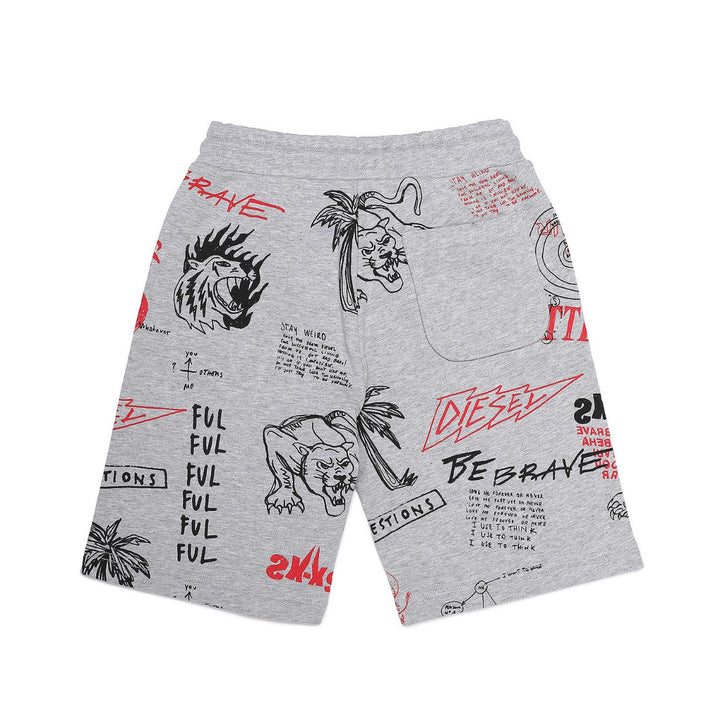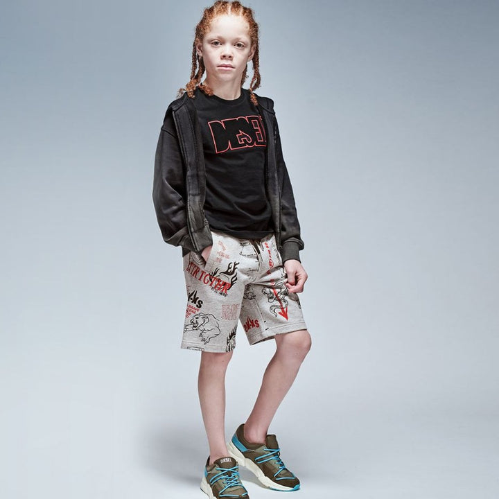 Boys grey jersey shorts by Diesel, made in soft and mid-weight cotton. They have a cool red and black sketched logo print and three useful pockets. The elasticated waist fastens with a drawstring.