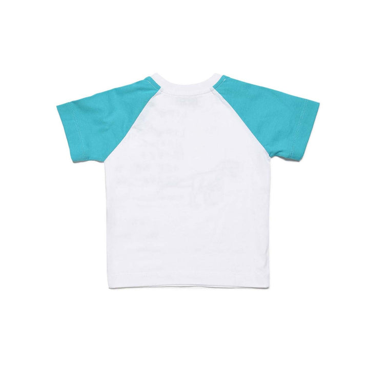 White Dinosaur & Slogan Printed T-Shirt With Blue Sleeves