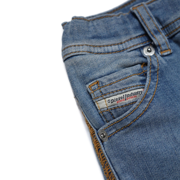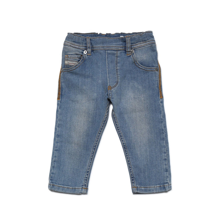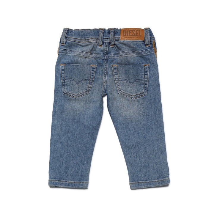 Light blue denim jeans by Diesel. Soft and stretchy, they have an adjustable elasticated waist and belt loops. They fasten with a button and zip, five pockets and logo rivets. The brand's logo patch is stitched on the back.