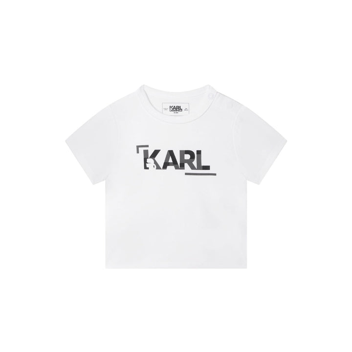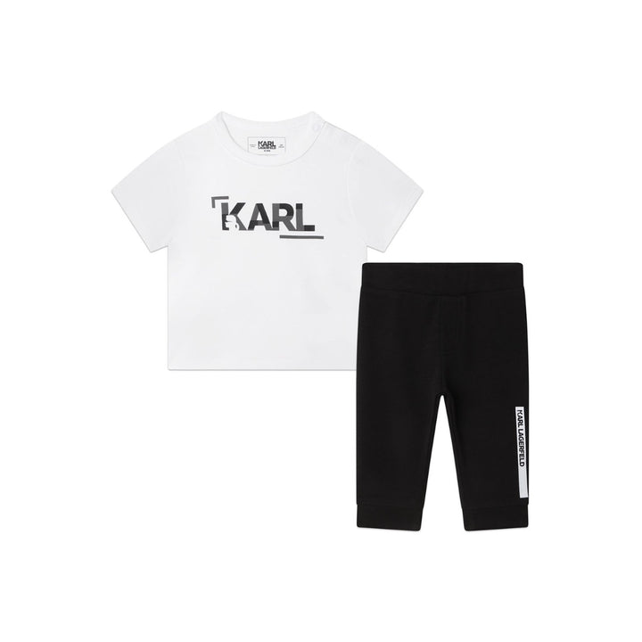Baby's first suit matches any occasion. Karl's iconic poplin shirt with logo print along the placket pairs with stretchy black pants for a classic-meets-Karl look for your kids
