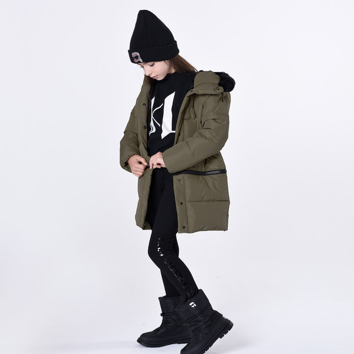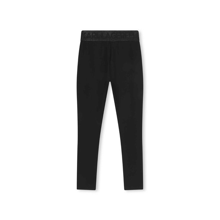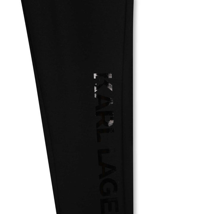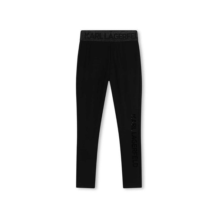 Black viscose leggings for girls by KARL LAGERFELD KIDS, made from soft, mid-weight jersey. Ankle length, these cool leggings have a shiny black brand logo printed down one leg for a subtle designer finish. The black sparkly, logo waistband is elasticated for a comfortable fit.