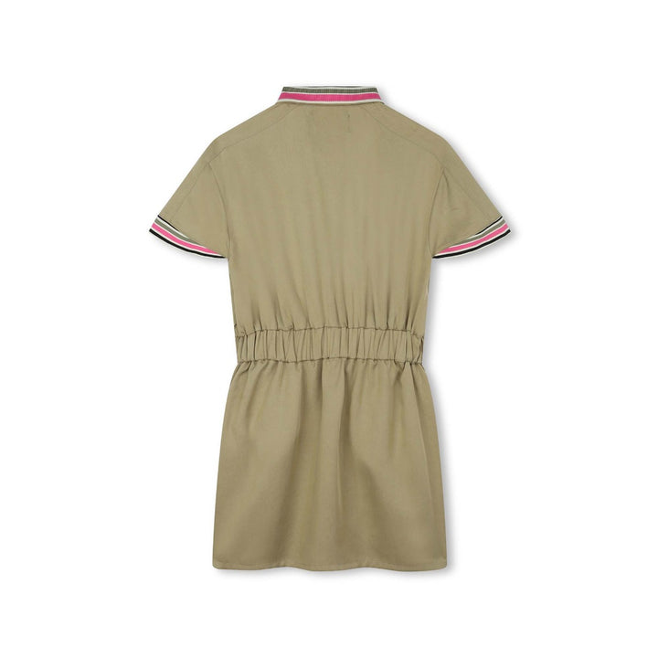 Girls light khaki green dress by KARL LAGERFELD KIDS, made in beautifully soft lyocell twill with an exposed zip fastening on the front. Great for casual looks, this short-sleeved dress has a subtle logo on the chest in tonal embroidery. Pink and black stripes can be seen on the collar and cuffs for an extra splash of colour. This daytime style, containing sustainable EcoVero fibres, is complete with an elasticated waistband and slanted front pockets.