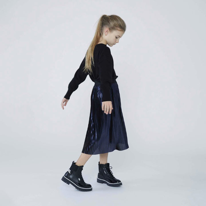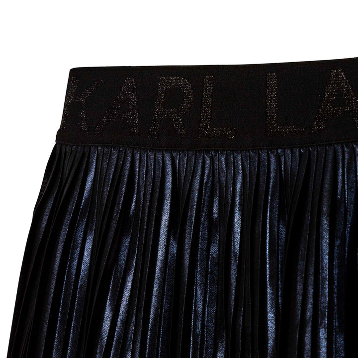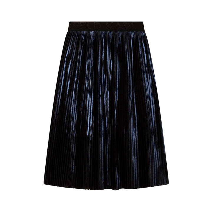 Stylish navy blue pleated skirt for girls by KARL LAGERFELD KIDS, lined in soft viscose for all-day comfort. Stylish and easy to wear, this midi skirt has metallic navy blue stripes on the sharp pleats, and a stretchy shimmery black jacquard logo waistband.