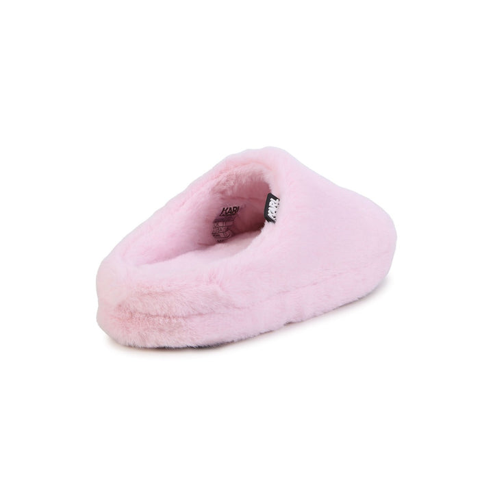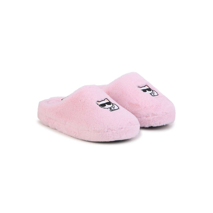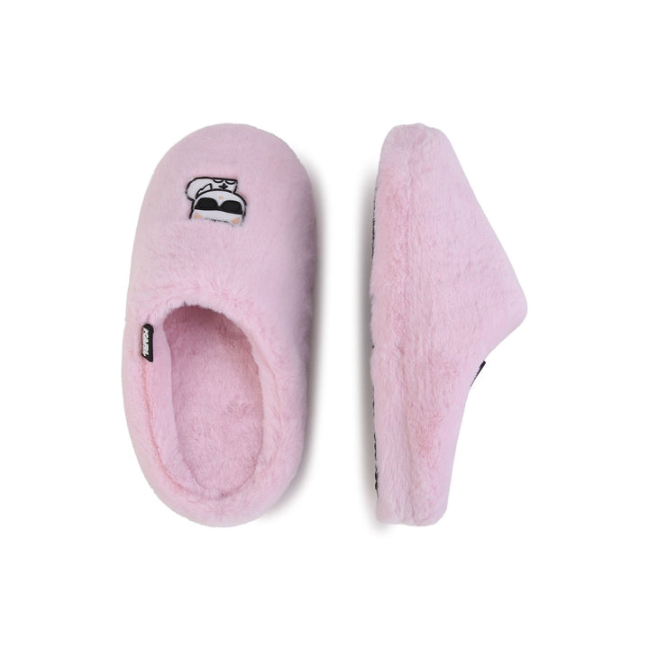 Cute Karl Lagerfeld slippers in pink, faux fur with an application on the instep of a white cat with sunglasses.\