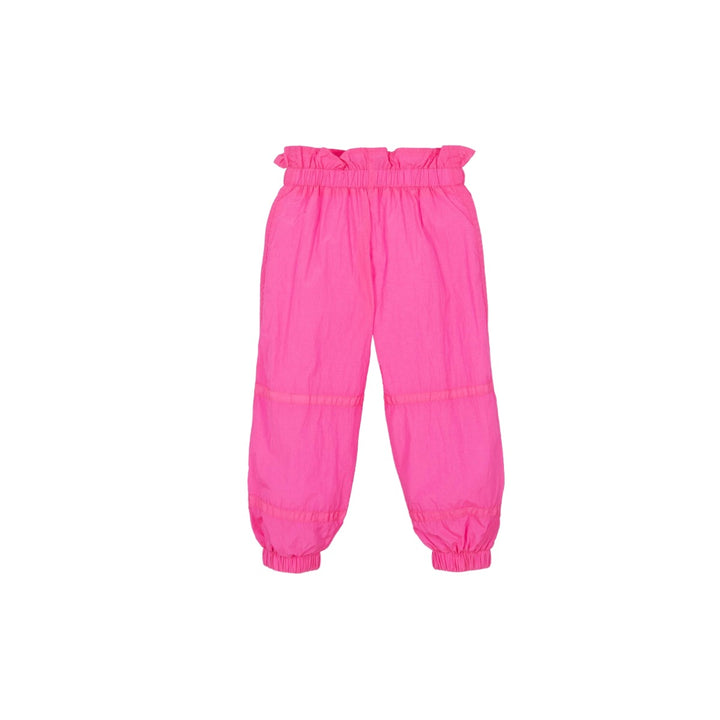 Fun, bright pink trousers for girls by KARL LAGERFELD KIDS. A sporty look, they have a gold foil logo print on one leg and faux drawstrings with matt gold toggle details. The pretty, paperbag waistband and leg cuffs are elasticated to allow easy pull-on. Silky, lightweight and water-repellent, they have pockets on the sides and a soft mesh lining for extra comfort.