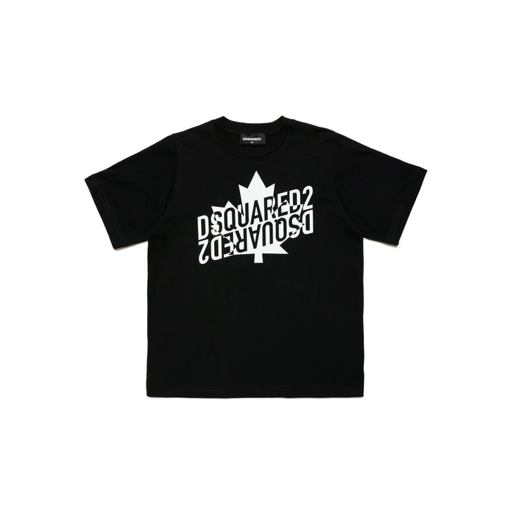 Crew-neck, short-sleeved, cotton jersey T-shirt. Fit- slouch fit, the brand's most oversized fit. The garment features a contrasting mirrored logo graphic on the front above a Canadian maple leaf, a distinctive element of the Dsquared2 world. A casua