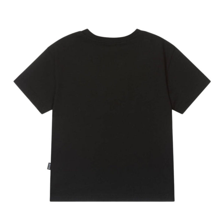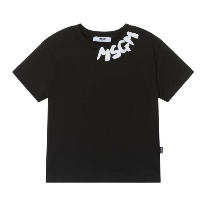 Black T-shirt for boys and girls by Italian brand MSGM, made in soft cotton jersey. For a cool designer look, it has a white brushed logo print on the ribbed crew neck and an embroidered tab on the side seam.