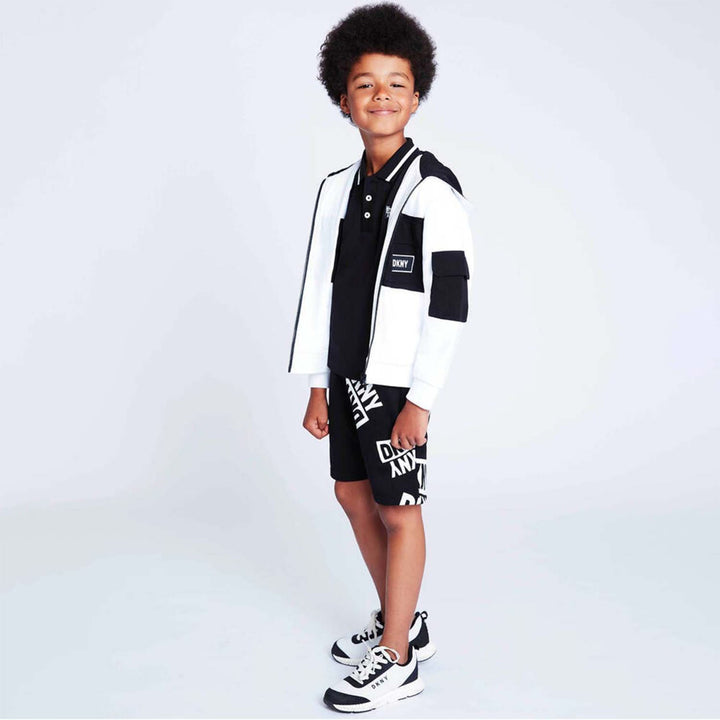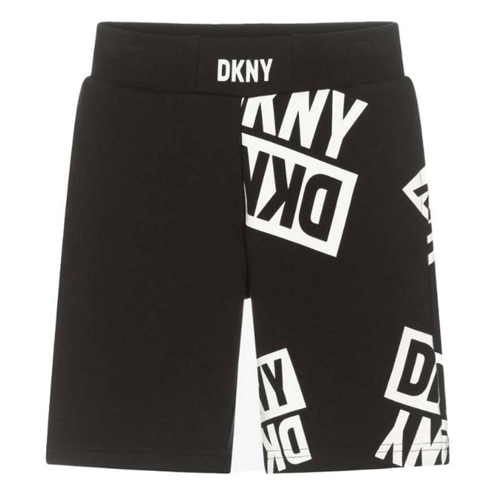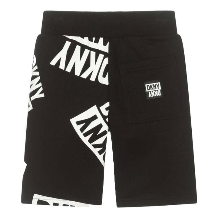 Boys and girls black cotton jersey shorts by DKNY, with on-trend box logo prints on one legs. Soft and comfortable, these easy-wearing bottoms have an elasticated waist and side pockets.