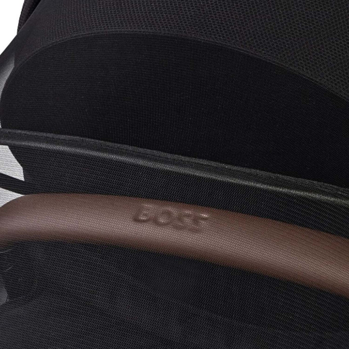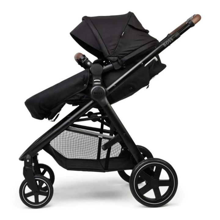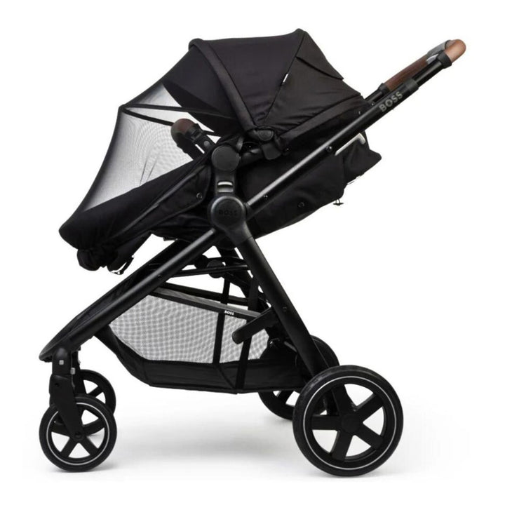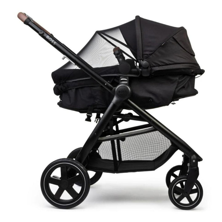 Made of 1% metallic leather, 1% polyurethane. The product features a matte finish, side logo print, engraved back logo, tiltable hood, anti-UV anti-mosquito net, flat side handle, reversible seat, removable protection with snaps, adjustable backrest
