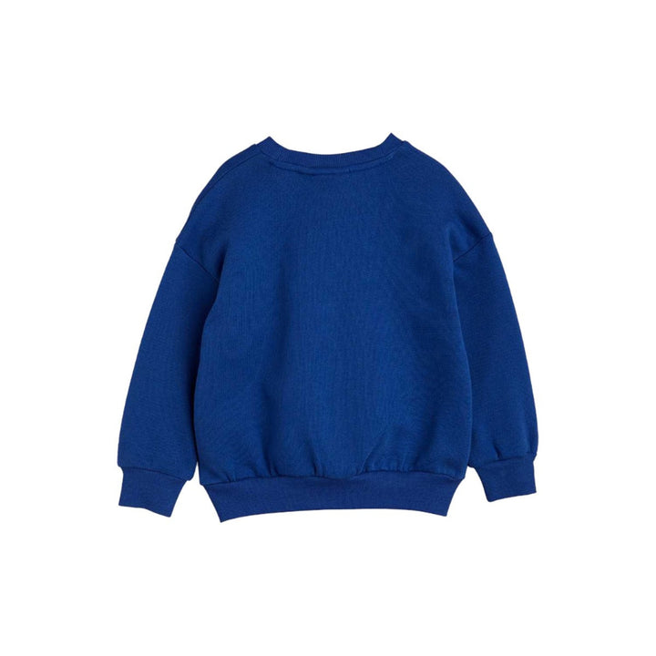 Blue sweatshirt with a What's Cooking print and embroidered cutlery, made from 1 % GOTS certified organic cotton. Designed with dropped shoulders for a relaxed fit and with ribbed cuffs at the sleeves, neck and bottom hem. Snap buttons at shoulder in