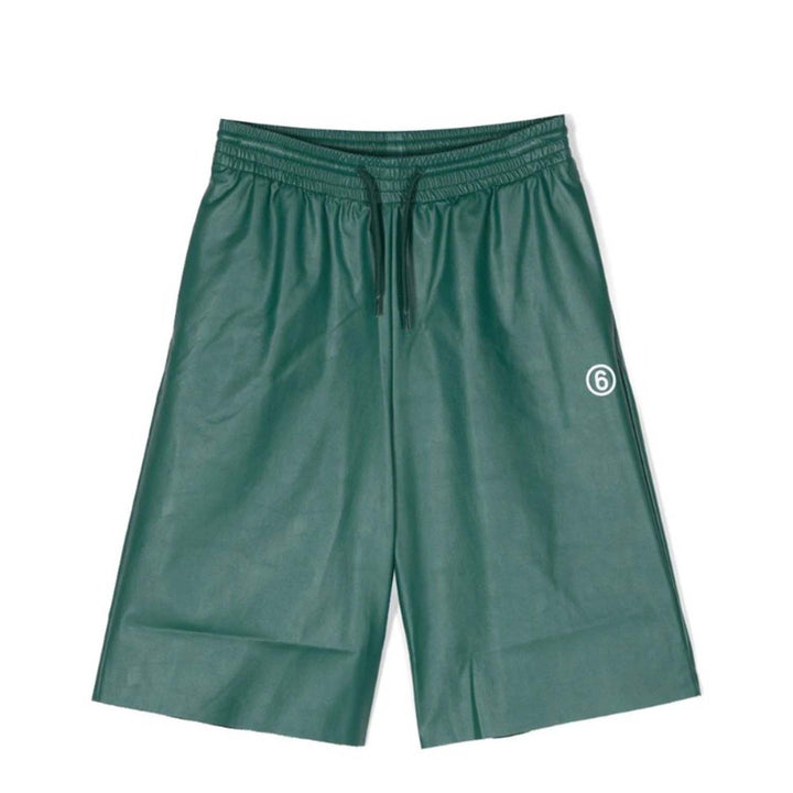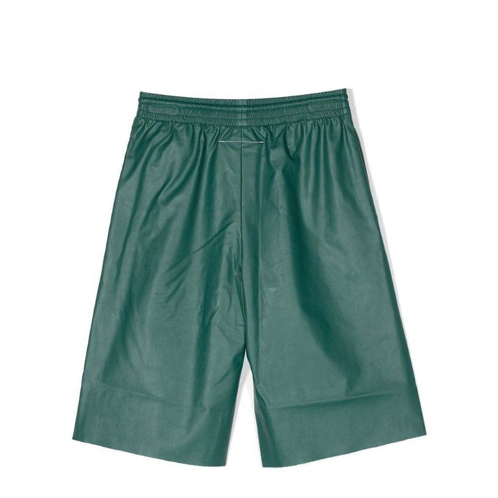 logo-embroidered shorts from MM6 Maison Margiela Kids featuring dark green, faux leather, decorative stitching, embroidered logo to the side, elasticated drawstring waistband, straight leg, raw-cut hem and two side slit pockets.