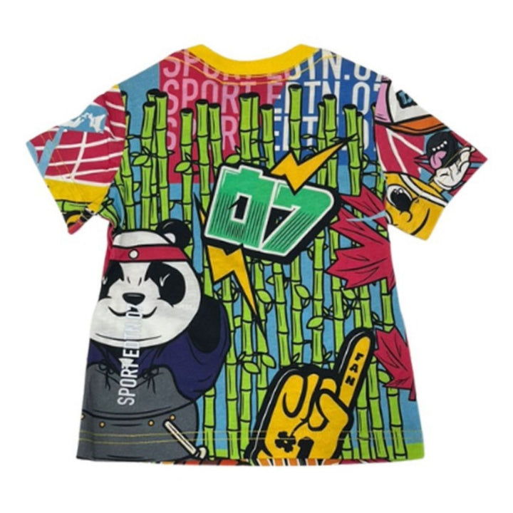 Blue t-shirt, in cotton, with short sleeves, ribbed crewneck, closure with automatic buttons on the chest. It is embellished with all-over Shibuya print and logo.