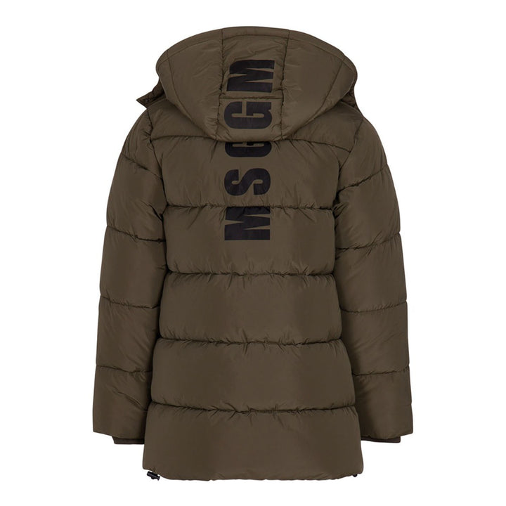 Silky smooth green puffer coat for boys & girls by Italian brand MSGM. It has black logo prints on the back, hood and cuffs for a signature look. Warmly padded with a silky lining, it has ribbed cuffs and a toggle adjusting drawstring hem for a cosy