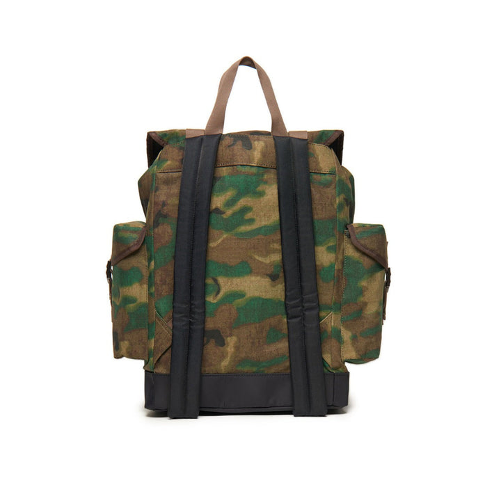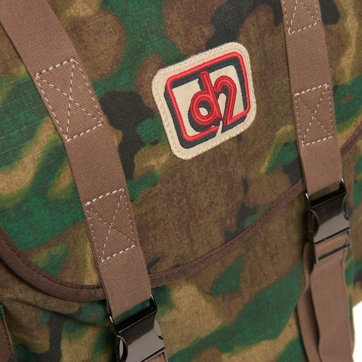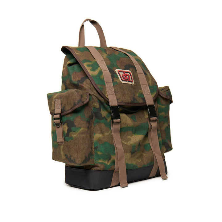 logo-patch camouflage-print backpack from DSQUARED2 KIDS featuring khaki, cotton, camouflage print, logo patch to the front, buckle-strap fastening, two side cargo pockets, two adjustable shoulder straps and main compartment.