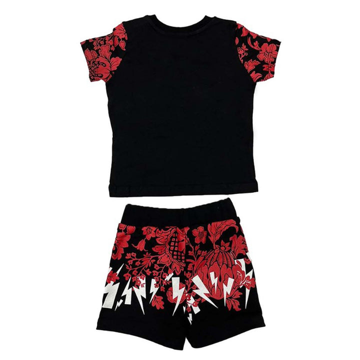 Boys Black/White/Red Cotton T-Shirt With All-Over Floral And Signature Thunderbolt Print On The Front Of Shirt, Paired With A Same Print Bottom Shorts. Fun And Easy Outfit For Your Kids.