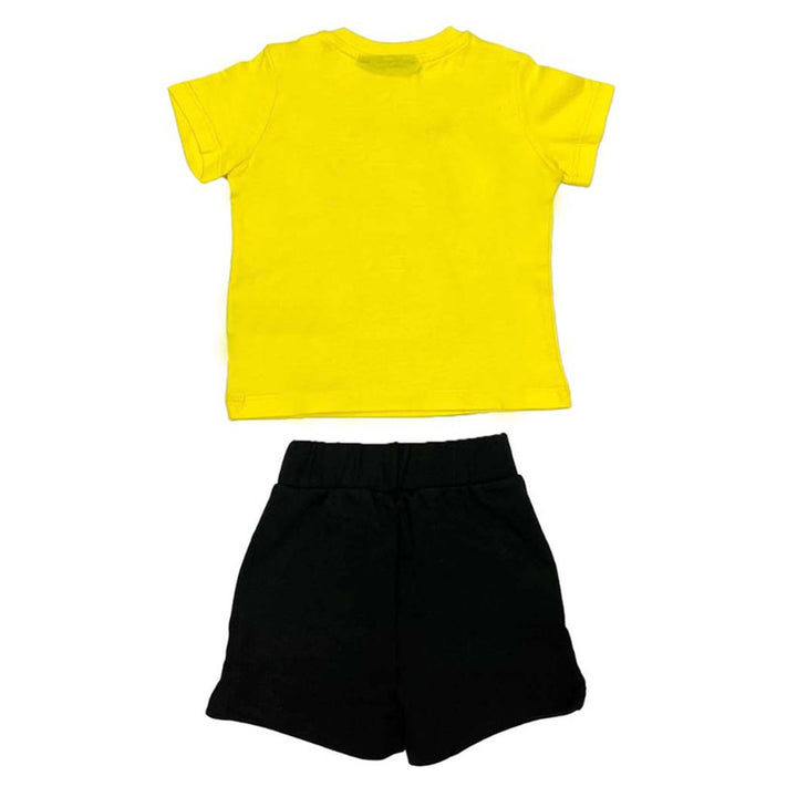 Boys Yellow T-Shirt With Signature Thunderbolt Print And Logo On The Front Of T-Shirt, Paired With A Black Bottom Shorts. Fun And Easy Outfit For Your Kids.