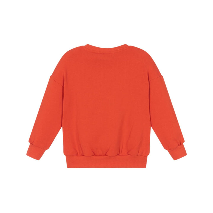 Playful sweatshirt for boys and girls by Mini Rodini, in a vibrant orange-red shade. Made in beautifully soft organic cotton jersey with a cosy fleece feel inside, it has a fun angry cat appliqué on the front in soft beige fleece with embroidered de