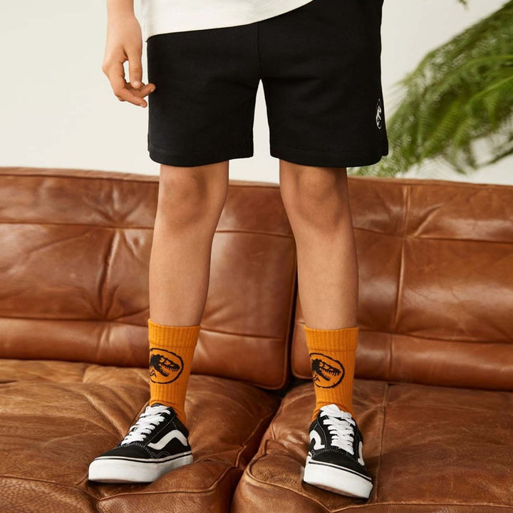 Molo x Jurassic World. Normann is a 2-pack with sporty socks in a rib quality. One pair is in black, and the other is in orange. Both pairs of socks have Jurassic logos on the sides. Molo is proud to present our fantastic international partnership wi
