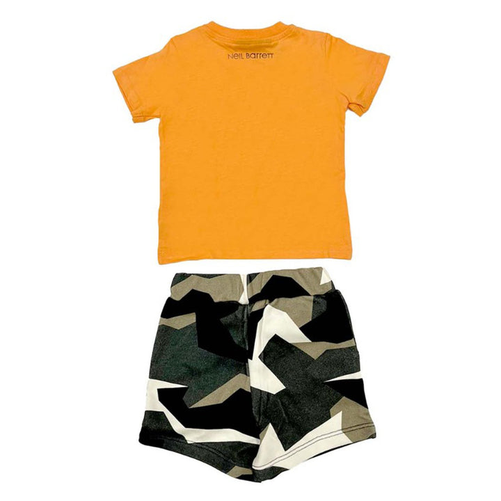 Boys Two Piece Jersey Set For Summers. The T-Shirt Is In Orange Color With Thunderbolt Print And A Contast Military Print Short Paired With It. Match It With A Similar Pair Of Shoes This Summer Season.