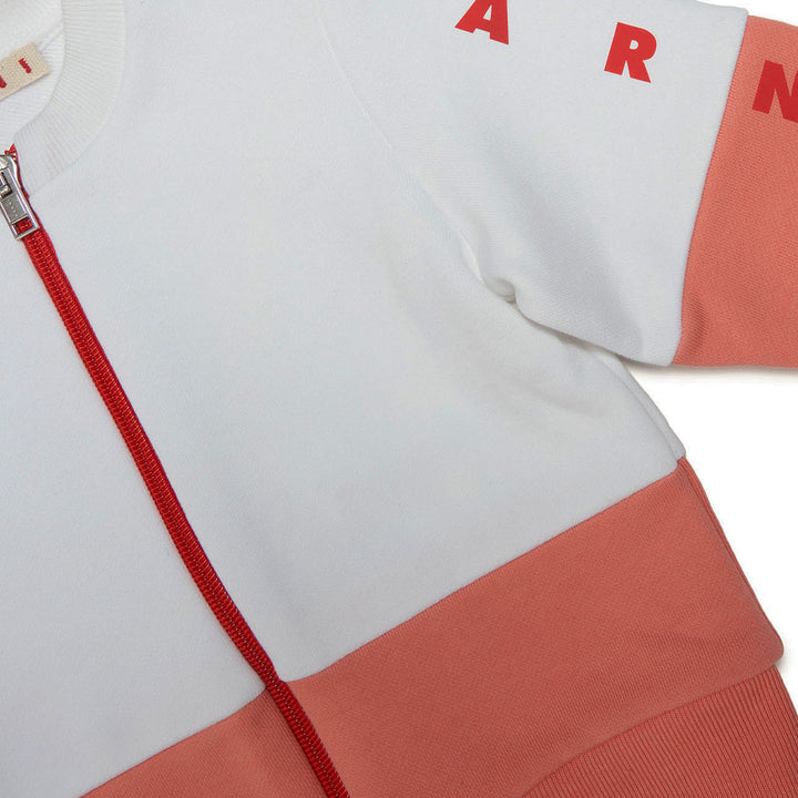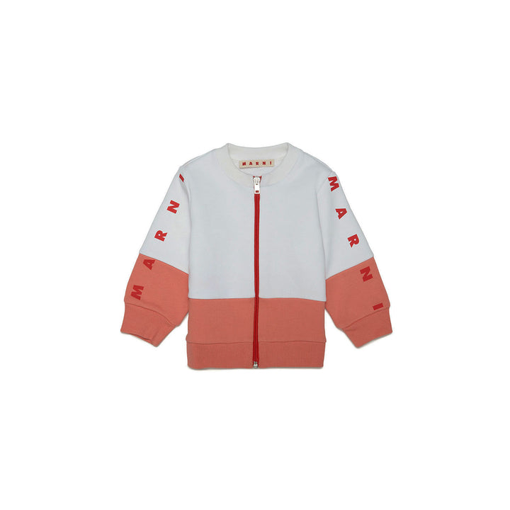 Kids Long-sleeved Jacket with contrasting zip. The garment reinterprets the colour block concept giving it a contemporary meaning of simplicity and lightheartedness, with Marni logo on the sleeves. Made from 1% cotton.