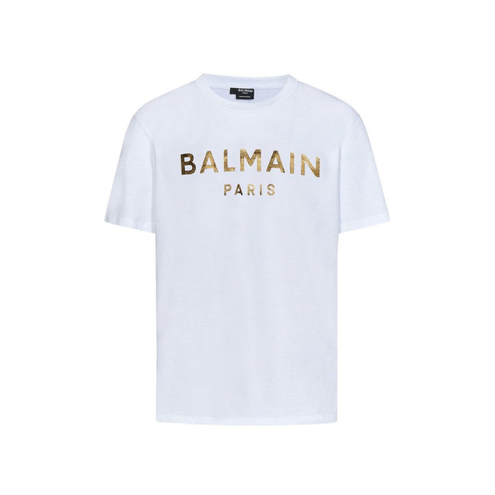 White cotton T-shirt for boys & girls from luxury French designer, Balmain. It has a shiny gold foil logo print on the front. Made in soft and stretchy jersey, it provides all-day style and comfort.