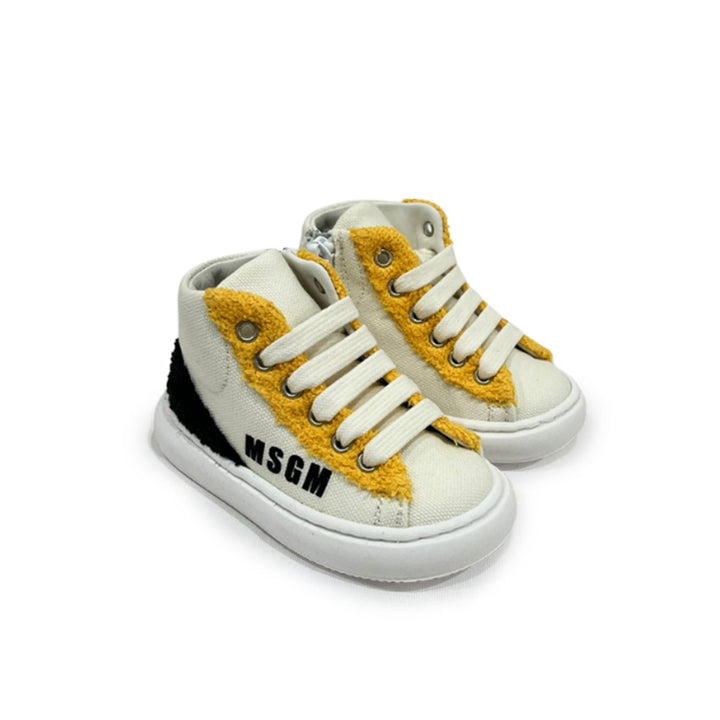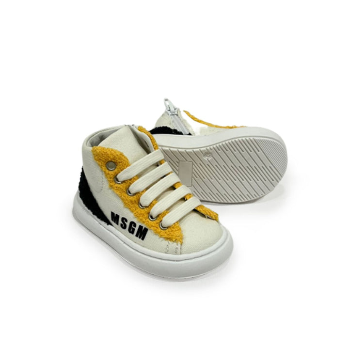 Adorable ivory trainers for kids by MSGM, with soft teddy fleece uppers. Fastening with laces and a side zip, they have black logo details on the tongue and the rubber heel trims. Ideal for keeping feet comfortable all-day, they have soft leather ins