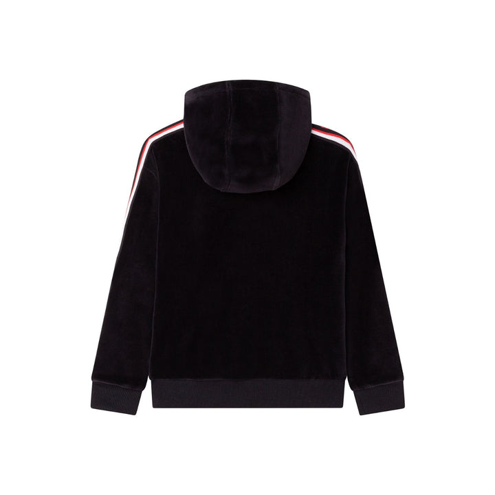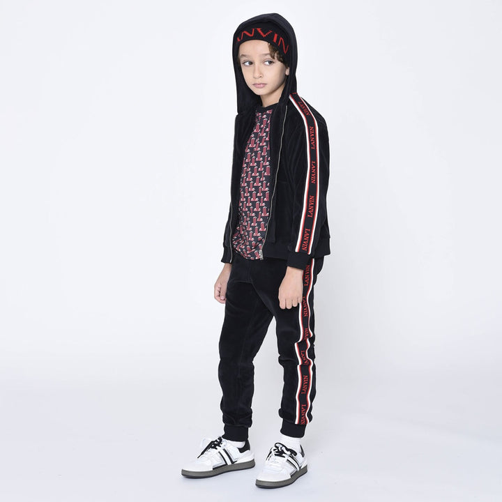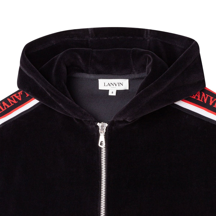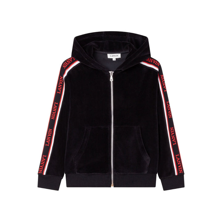 Lanvin black hooded cardigan with a zip in fron and a red border on the side from shoulder to hand length sleeve. Your boys will rock the cardigan.