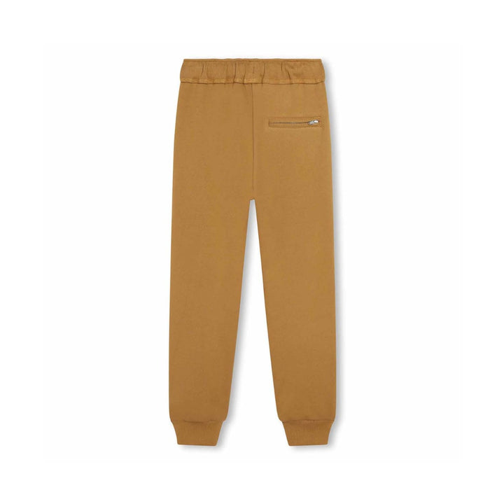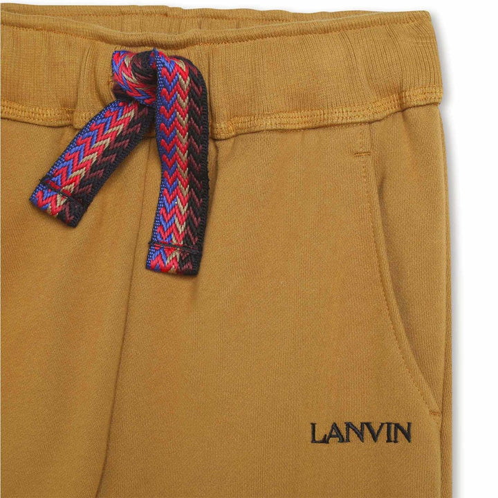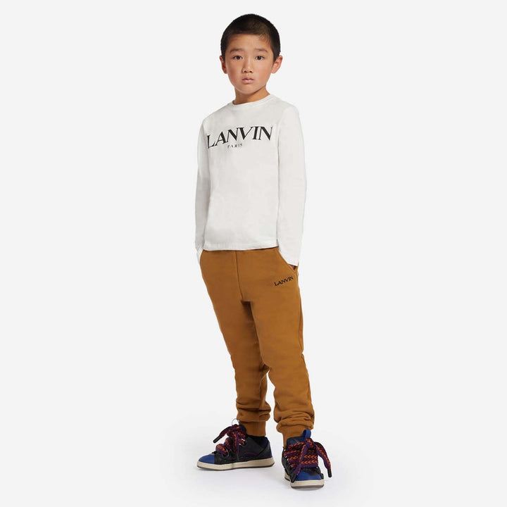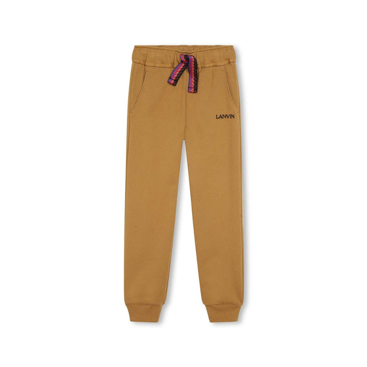 Brown joggers for boys by luxury French brand Lanvin, made in soft, mid-weight cotton jersey, with a warm and cosy fleecy inside and ribbed cuffs. Casual and comfortable, they have a black logo embroidered on the front, slanted front pockets and a zip fastening pocket on the back. The ribbed waistband has a multicoloured Curb detail drawstring tie ensuring a comfortable fit.