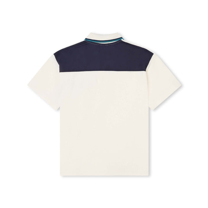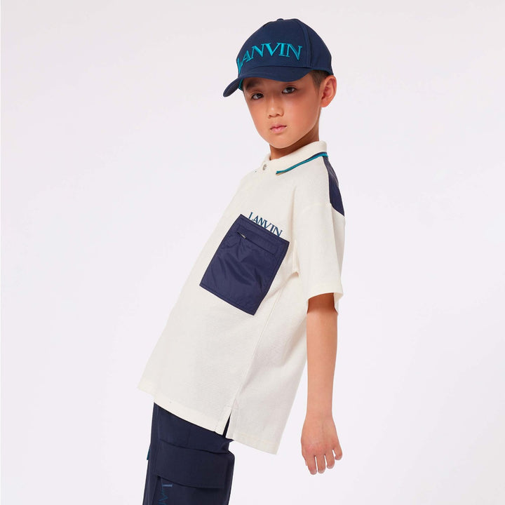 Ivory short-sleeved polo shirt for boys by luxury French brand Lanvin. It has teal and navy blue striped trim on the ribbed collar, with a navy blue zipped chest pocket in silky smooth fabric. The designer's name is displayed above the pocket, in bold rubberised letters, for a signature look. Made in soft cotton piqué, this casual top has popper fastenings on the front placket, with vented sides for ease of movement.