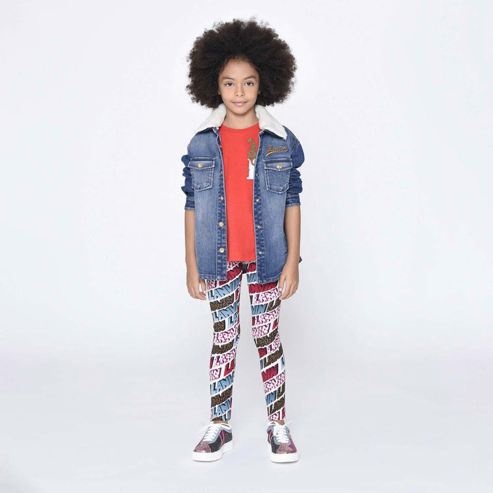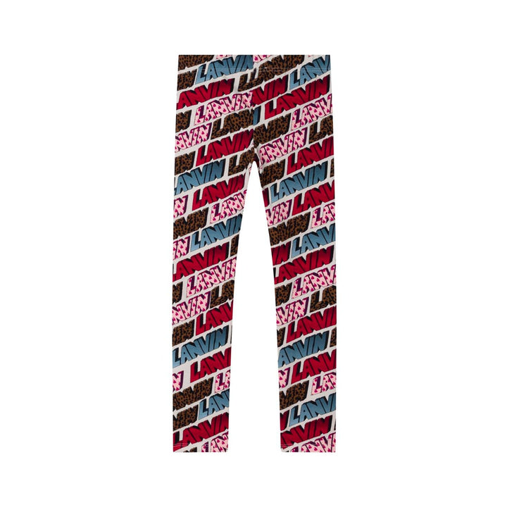 Girls cotton Leggings by French designer Lanvin, patterned with red, blue and green logos on an ivory background. Inspired by the adult collection, they have silver logo aglets on the drawstring waistband, with two pockets on both the front and back. They are made in comfortable mid-weight jersey.
