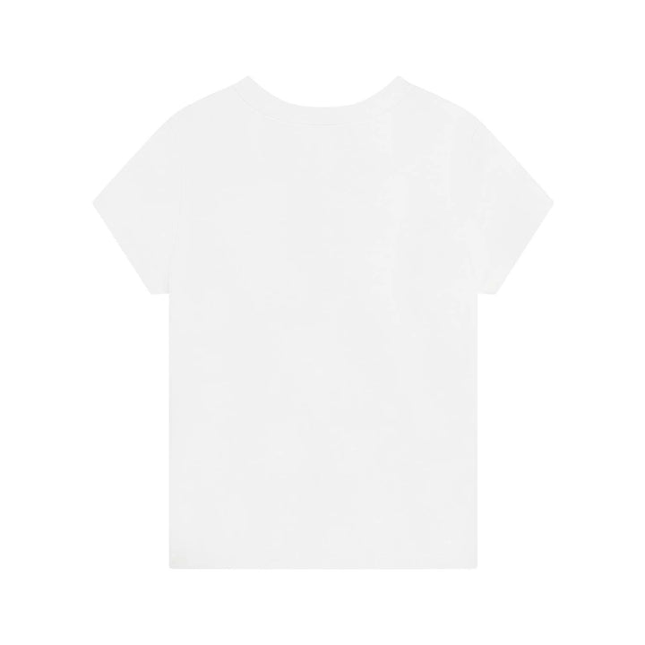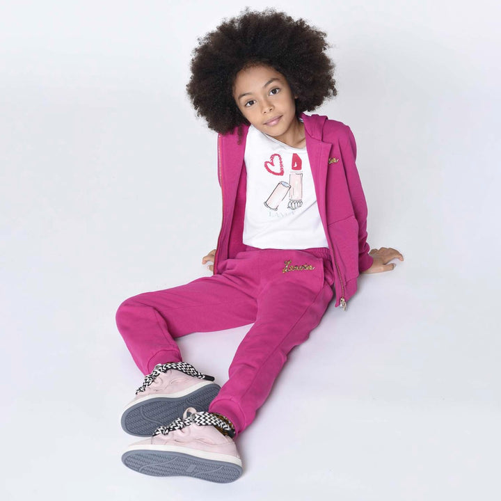 White T-shirt for teen girls by French designer Lanvin. It has a blue logo with a pink and red lipstick print above, sparkling with diamantés, and is made in comfortable cotton jersey.