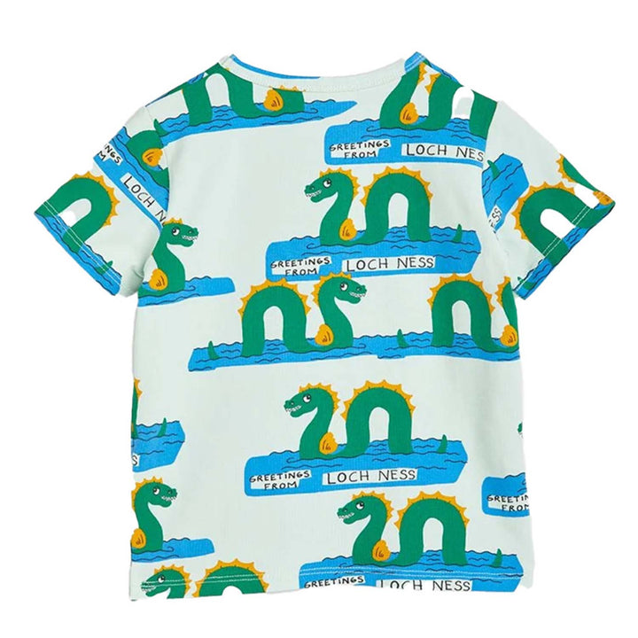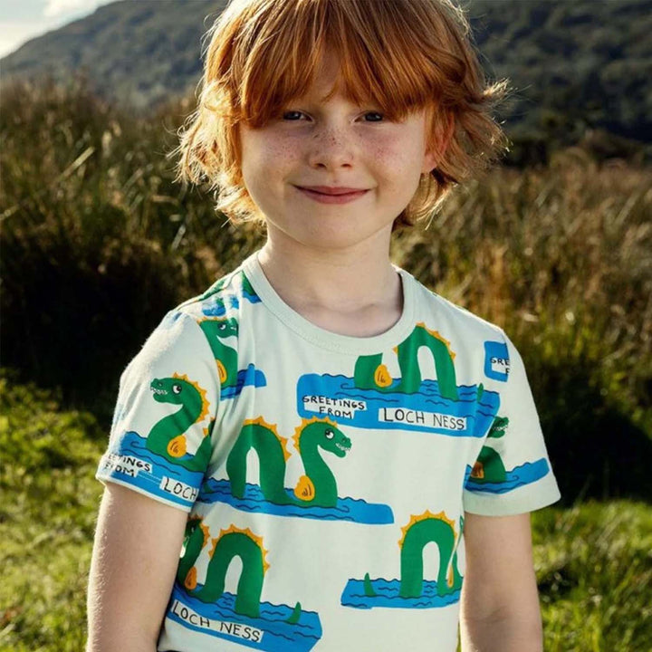 Green T-shirt with an all over Loch Ness print, made from GOTS certified organic cotton with a hint of stretch. The T-shirt has a binding at the neck and is designed for a medium slim fit. The smallest sizes (56/62–68/74) have snap buttons at the s
