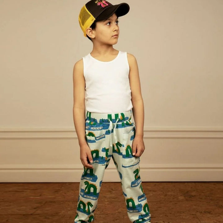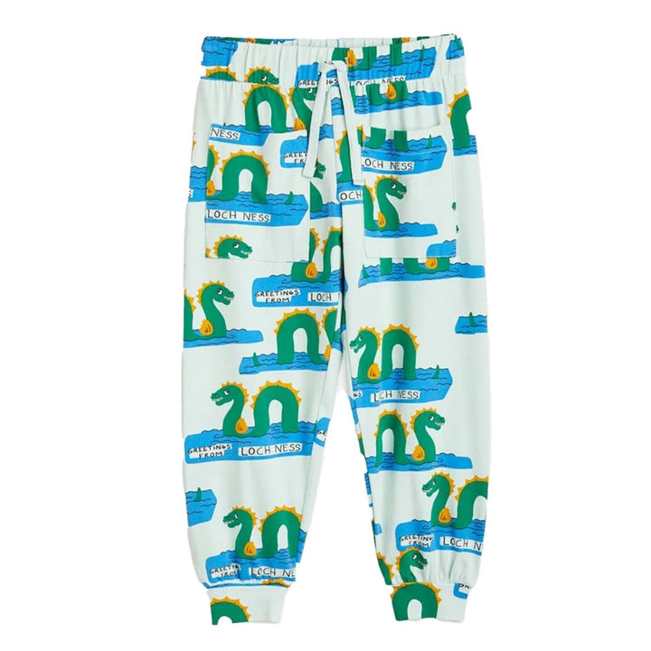 Green trousers with all over Loch Ness print made from GOTS certified organic cotton with stretch. Designed with two front pockets, cuffs and an elastic drawstring waist.