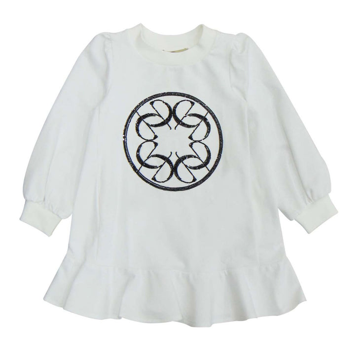 Looking for a smart yet comfortable dress for your little girl? How about this White Logo sequin embroidered dress? The logo design on the front with the frilled hemline altogether are making it a super cute option to dress your daughter.