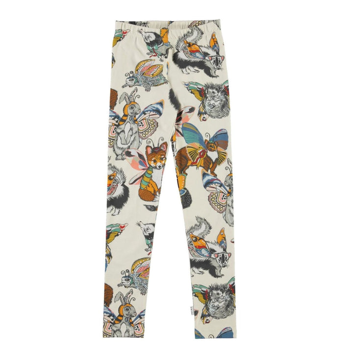 Molo's classic, long leggings with a print of forest animals with wings. They are constructed in a stretchy, cotton blend fabric with an elastic waist for a good fit. This Molo product is GOTS certified organic, which means that it is made with certified organic materials and produced under the strictest social and environmental standards throughout the entire manufacturing process. In addition, the GOTS certification secures that the product is free of hazardous chemicals. This Molo product is GOTS certified organic by Ecocert Greenlife, certification number 197496.