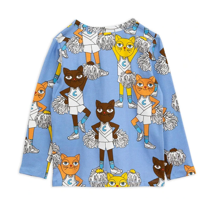 A classic grandpa style, this blue long-sleeve top is made of soft GOTS certified organic cotton enhanced with stretch for easy wear. With an all-over print featuring cheerleader cats, it has a clean finish and closes with snap buttons at the chest.