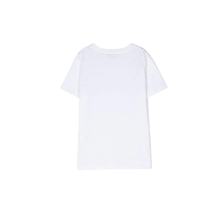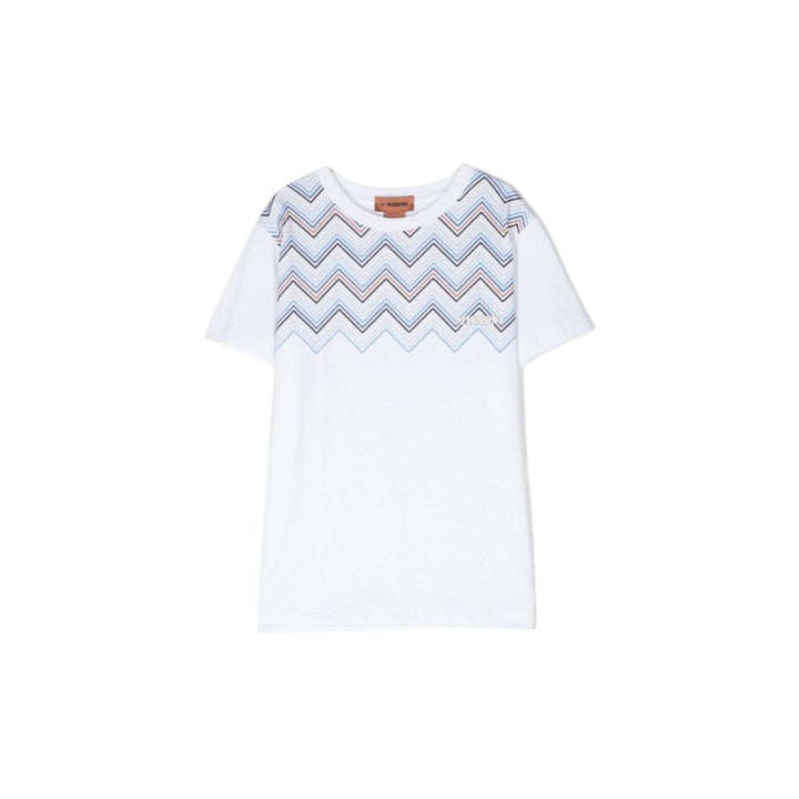 zigzag-print short-sleeve cotton T-shirt from MISSONI KIDS featuring white, cotton, zigzag print, logo print at the chest, round neck, short sleeves and straight hem.