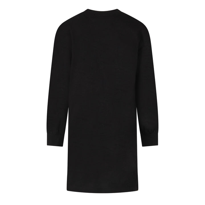 Black dress for girls by MSGM, made in soft cotton jersey. It has a large red broken heart appliqué on the front, and two loose silky polyester panels with a white heart print.