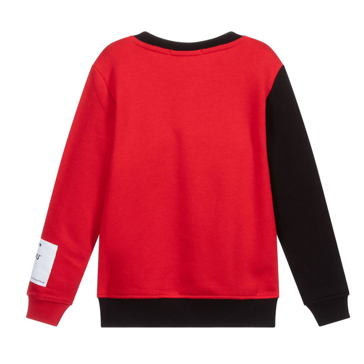 Black and red sweatshirt by Italian brand MSGM, suitable for both boys and girls. With a large white logo across the front, it is made in comfortable cotton jersey with a fleecy underside, and has a logo patch on one arm.