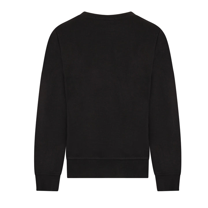 Girls black sweatshirt by MSGM, with a gold logo embroidery on the front. It is made in stretchy cotton jersey with a soft fleecy inside.