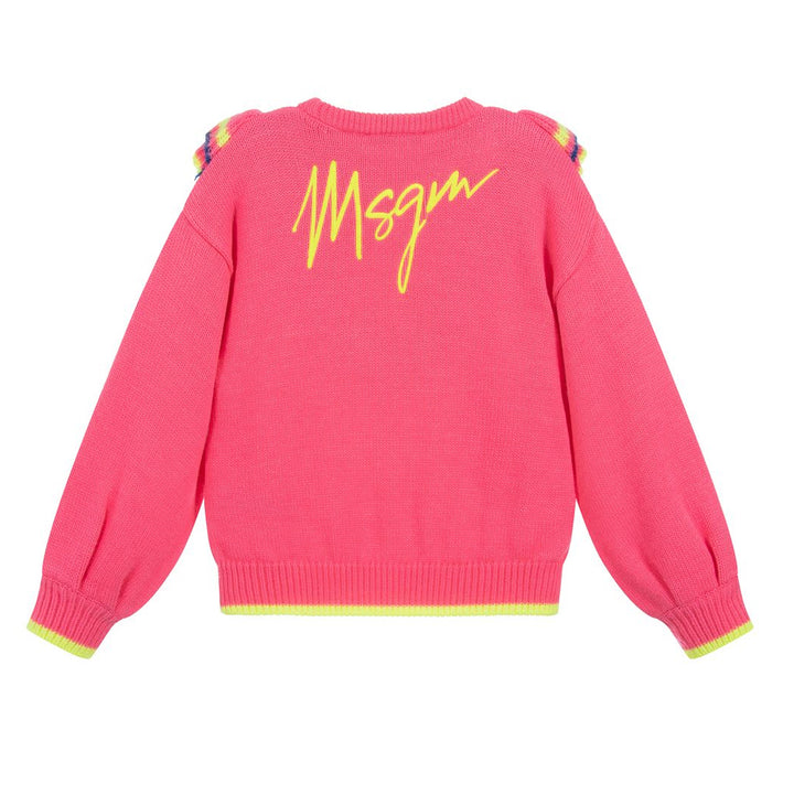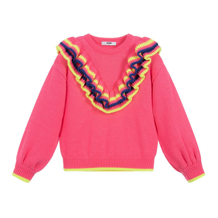 Girls neon pink sweater by Italian brand MSGM, knitted in a mid-weight acrylic, wool and alpaca blend. It has ruffles on the front, striped in neon yellow and purple, with neon yellow trims on the cuffs and hemline. A large matching logo is embroidered on the back.
