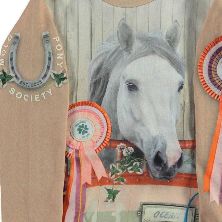 Marlee is a pink sweatshirt with a print of horses on the front and a rosette and horse shoe on the sleeves. This Molo product is GOTS certified organic, which means that it is made with certified organic materials and produced under the strictest social and environmental standards throughout the entire manufacturing process. In addition, the GOTS certification secures that the product is free of hazardous chemicals. This Molo product is GOTS certified organic by Ecocert Greenlife, certification number 197496.