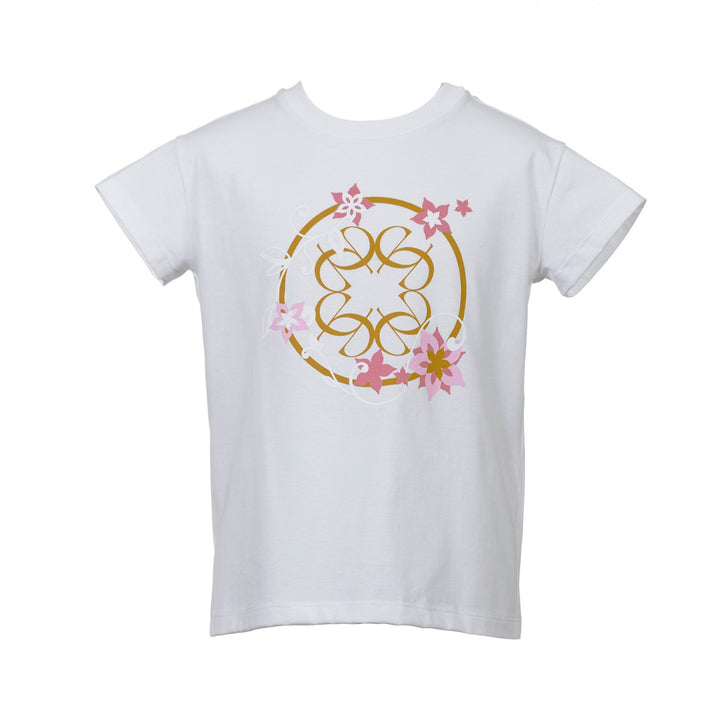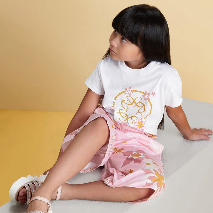 White T-shirt for teen girls by Elie Saab, made in soft and stretchy cotton jersey. It has the brand's mustard yellow logo printed on the front, with pink and white flowers.