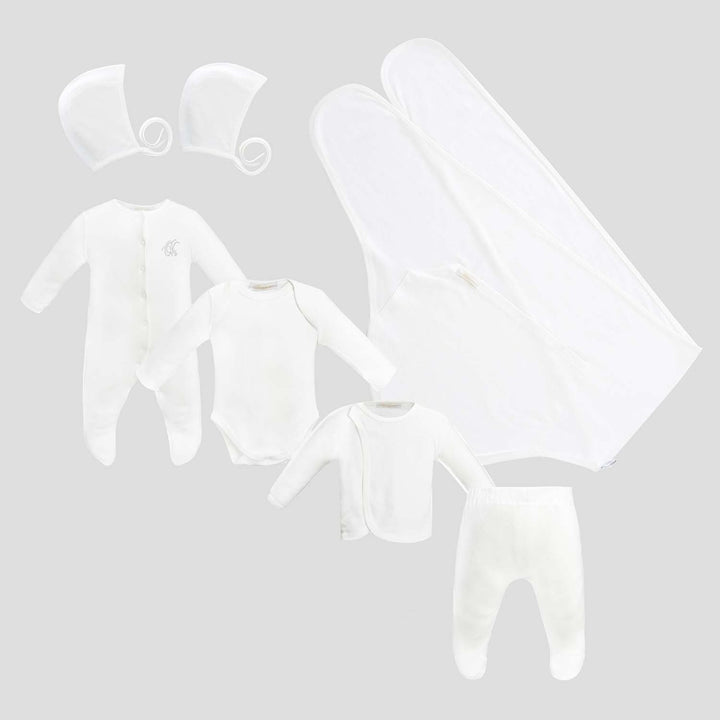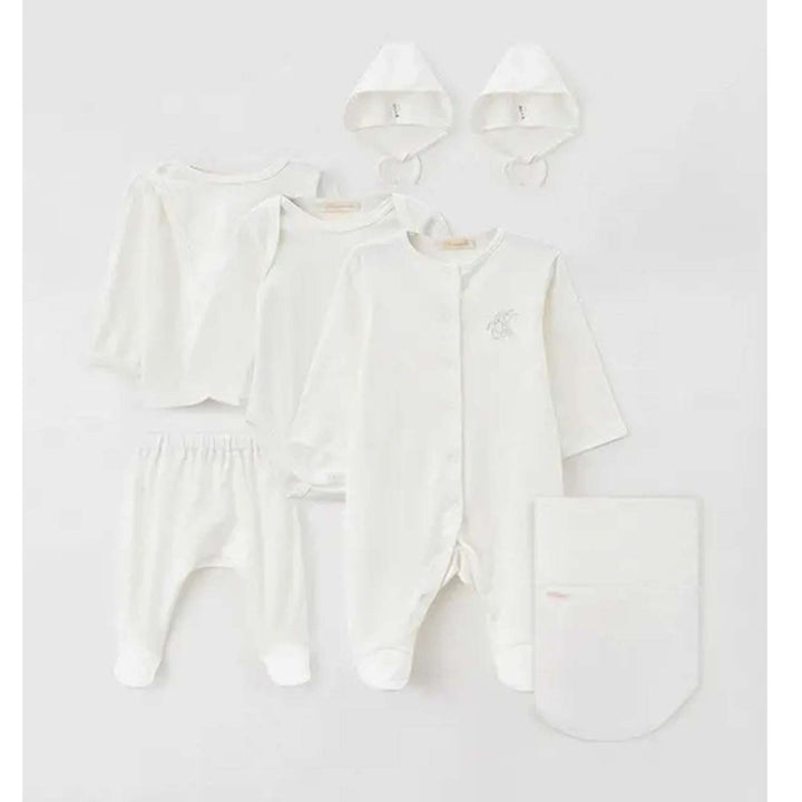 A knitwear set for a newborn consists of seven of the most necessary items and is suitable for a child of any sex. Since it is made of natural cotton of the dairy shade. Comfortable fasteners and soft elastic on the sliders will allow the baby to feel as comfortable as possible.
