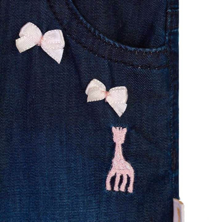 Blue Cotton Denim by sophie la girafe for baby girl with bow on pockets side and elasticated hem.