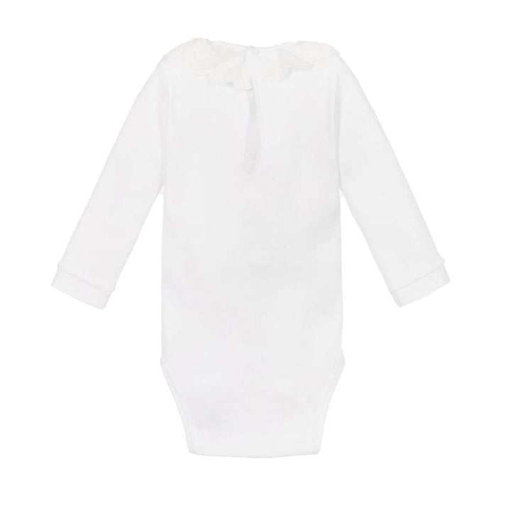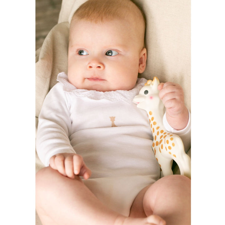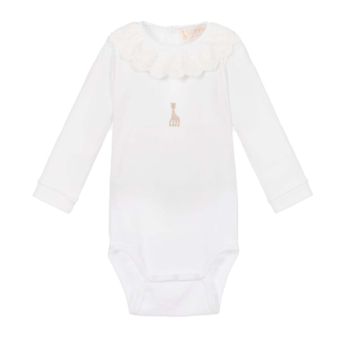 Cute white bodysuit for baby girls and boys, by Sophie la Girafe. Made from soft cotton jersey, it has a sweet Sophie la Girafe print in beige on the front and a delicate broderie anglaise frill collar.