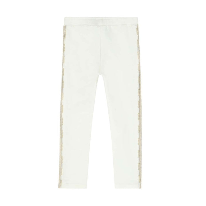 Ivory logo leggings for girls by Aigner Kids. Made from soft cotton, it features the brand's iconic horseshoe logo print on the front and gold glittery houndstooth panel with logo tape trim on the side. An elasticated waistband for comfortable fit.