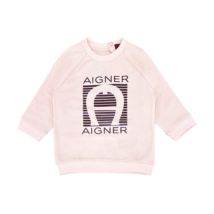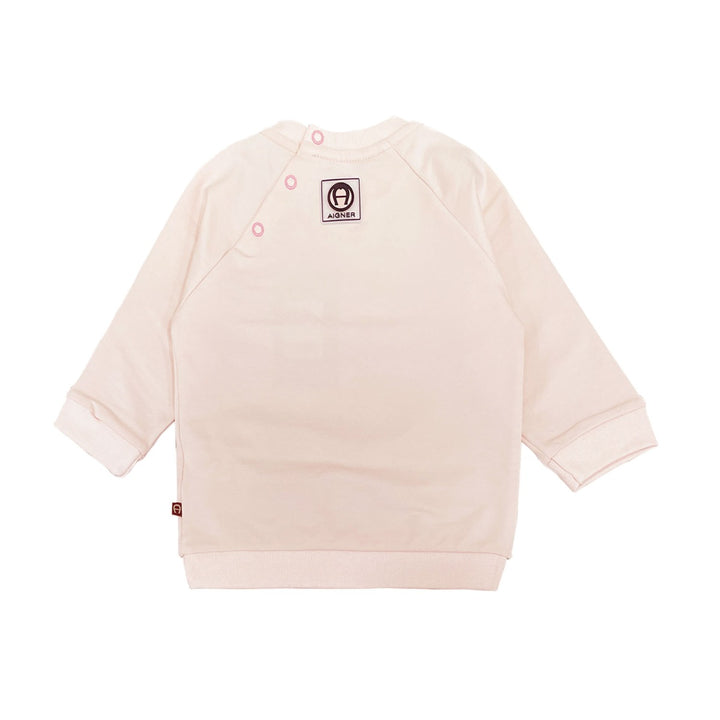 Pink logo sweatshirt for girls by Aigner Kids. Made form soft cotton, it features the brand's iconic horseshoe logo silhouette and brand name print in metallic rose-gold on the front and it has a logo rubber badge at the back neck.